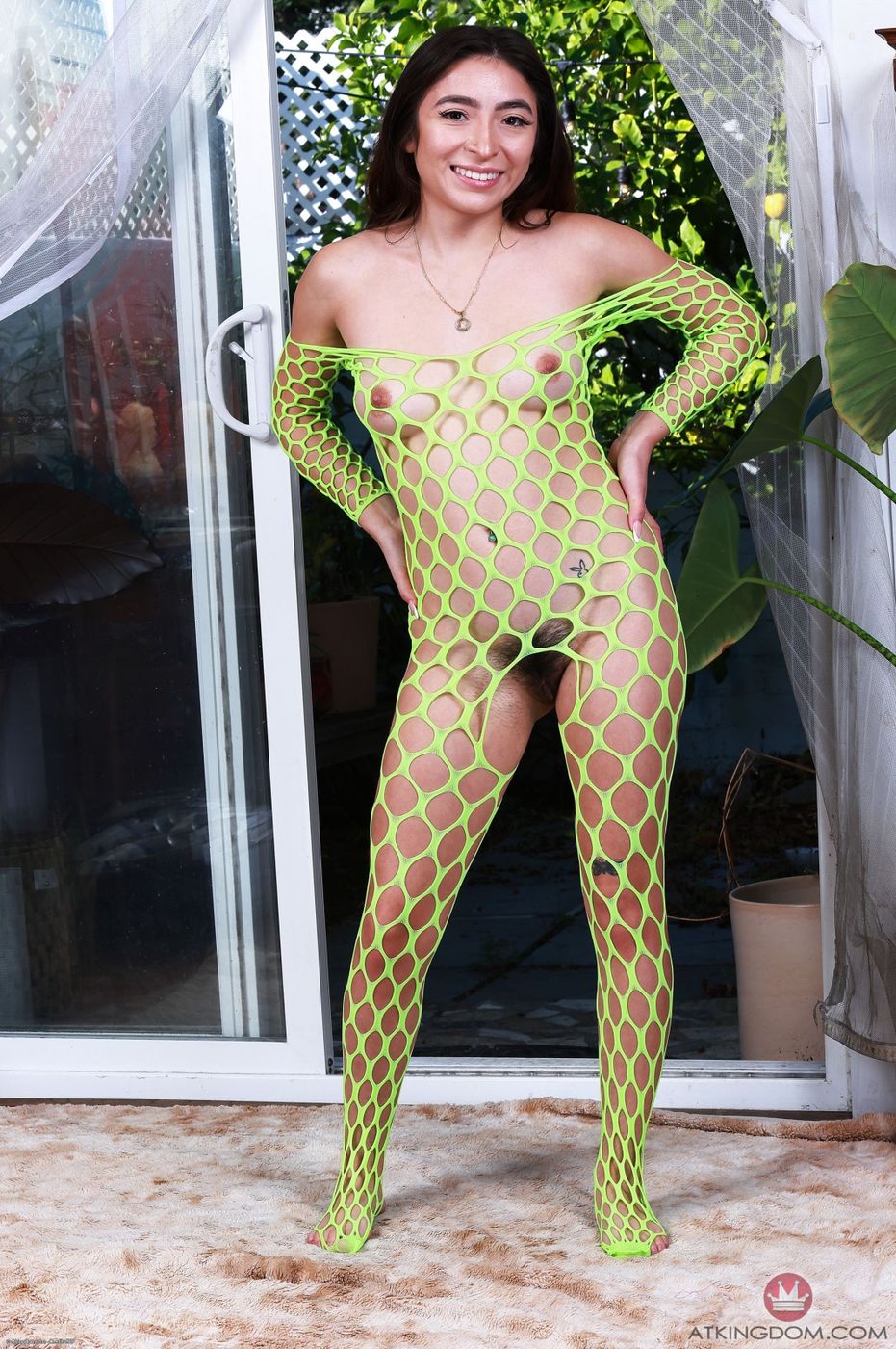 ATK Natural & Hairy: Amber looks great in her neon fishnet body suit.
